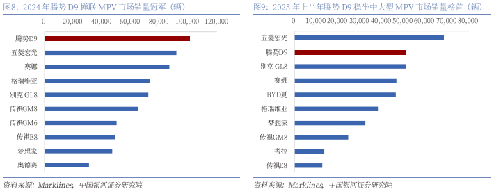 2024年腾势D9蝉联MPV市场销量冠军,2025年上半年稳坐中大型MPV市场销量榜首。2024年腾势D9实现销量10.1万辆,蝉联MPV市场销量冠军,2025年上半年,腾势D9实现销量5.1万辆,位居全品类MPV市场销量第二名,仅次于五菱宏光,若仅考虑中大型MPV,腾势D9仍稳居销量榜首,市场龙头地位稳固。另外,腾势D9还在2023-2024年连续两年获得MPV保值率、用户满意度冠军,实现MPV销量、保值率、用户满意度“三冠王”,产品获得用户认可。