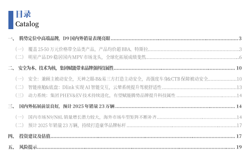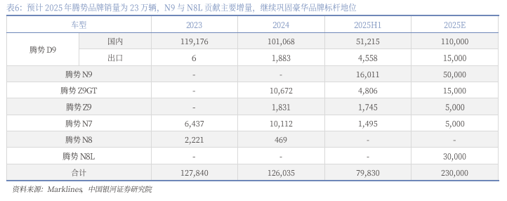 预计2025年腾势品牌销量为23万辆,N9与N8L贡献主要增量,继续巩固豪华品牌标杆地位。预计2025年腾势D9国内销量为11.0万辆,出口1.5万辆,N9下半年快速上量,预计全年销量5万辆,N8L有望延续N9强产品力,市场拓展前景良好,预计全年销量3万辆,N9与N8L贡献腾势品牌主要增量,腾势D9保持MPV市场龙头地位并持续拓展海外,助力腾势品牌继续巩固豪华市场标杆地位。