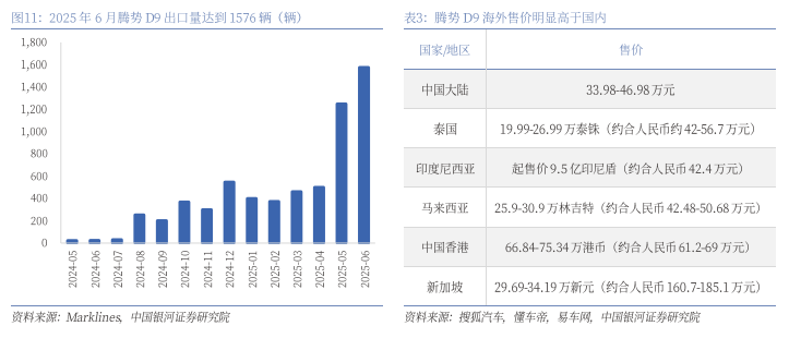 D9出口销量快速攀升,海外更高起售价进一步提升高端品牌形象。2025年以来,受益于D9在海外市场拓展取得的良好成效,D9出口量快速攀升,2025年6月D9出口达到1576辆,在国内高端豪华产品中排名前列。腾势D9在海外市场售价明显高于国内市场,其中新加坡售价折合人民币超160万元,超过丰田埃尔法当地售价(折合人民币约140万元),进一步提升了腾势品牌的全球高端形象。