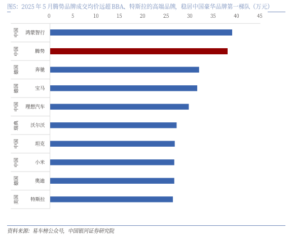 腾势品牌成交均价远超BBA、特斯拉的高端品牌,稳居中国豪华品牌第一梯队。据易车榜数据,2025年5月,腾势品牌成交均价约为38.0万,仅次于鸿蒙智行,远超BBA、沃尔沃、特斯拉等高端品牌,品牌豪华属性十足,稳居中国豪华品牌第一梯队。