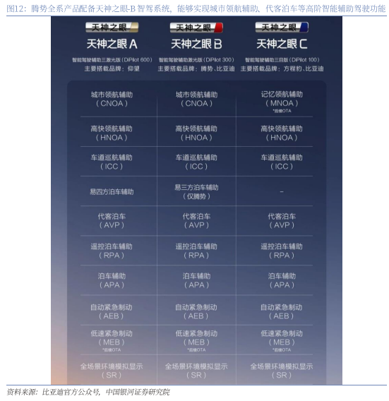腾势品牌全系产品配备天神之眼-B智驾系统,实现行业第一梯队智驾能力。腾势品牌除D9低配版(无激光雷达)外,其余全系产品标配天神之眼-B智驾系统,采用英伟达Orin芯片与激光雷达,能够实现城市领航辅助、高快领航辅助、代客泊车等高阶智能辅助驾驶功能,已经具备行业第一梯队的智驾能力。