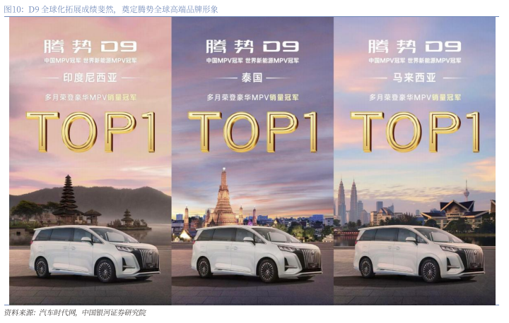 D9全球化拓展成绩斐然,打破日系车东南亚地区垄断,奠定腾势全球高端品牌形象。D9作为腾势品牌首款出海车型,在全球化拓展中取得亮眼成绩,2025年上半年,腾势D9成为泰国、印度尼西亚、马来西亚市场豪华MPV销量冠军,打破日系车垄断,还成为印度尼西亚上半年最畅销电动车榜亚军和泰国1-5月新能源汽车销量TOP10车型之一。在港澳地区,腾势D9获得澳门市场2025年上半年新能源MPV销量和国产MPV销量双冠军,并创下香港电动MPV累计上牌量第一的佳绩。另外腾势D9还在海外获得了高端用户的认可,中国香港财政司司长专车的与顶级圈层“15号”车牌车主均更换为腾势D9,泰国足协主席伍伦盼、亚洲最年轻纳斯达克上市公司创始人何猷君、香港TVB视帝陈豪、陈茵微夫妇等政商名流均选择D9作为私人座驾,D9在海外市场热销成功奠定了腾势品牌的全球高端品牌形象基础。