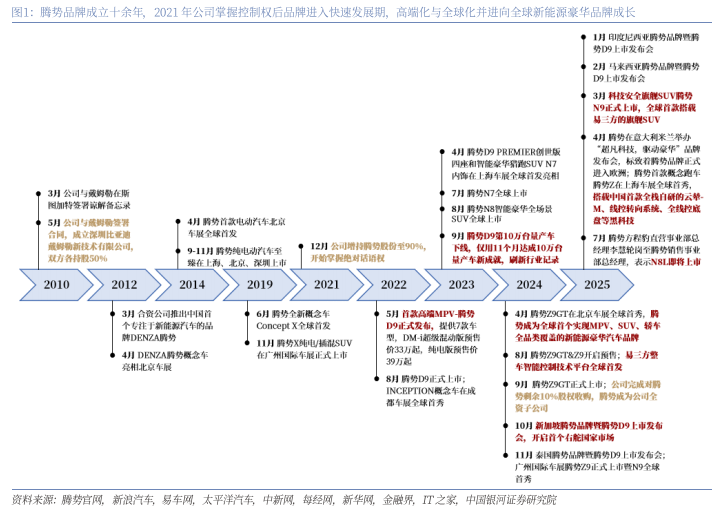 腾势品牌成立十余年,2021年公司掌握控制权后品牌进入快速发展期,高端化与全球化并进向全球新能源豪华品牌成长。腾势品牌成立于2012年,最早于2010年公司与戴姆勒签署谅解备忘录并合资成立深圳比亚迪戴姆勒新技术公司,双方各持股50%,2012年合资公司发布中国首个专注于新能源汽车的品牌DENZA腾势,并在北京车展亮相首款概念车。但由于早期我国新能源汽车市场发展不成熟,消费者接受程度不高,高端品牌市场拓展效果不明显,且由于合资公司中双方话语权相当,在新能源车市场发展早期双方磨合程度欠佳、战略调整步伐滞后,造成腾势品牌发展较为缓慢。2021年公司增持腾势股份至90%,开始掌握绝对话语权,腾势品牌发展开始与公司主品牌接轨,受益于公司前瞻性的新能源技术发展与市场拓展步伐,腾势品牌在2022年通过首款高端MPV市场快速打响市场声誉,仅用时11月达成10万台量产车成就,刷新行业记录,并在2023、2024年连续两年成为中国MPV全市场销量冠军。2023年以来腾势品牌产品矩阵快速丰富,2023年上市SUV产品N7、N8,2024年上市轿车产品Z9GT,成为全球首个实现MPV、SUV、轿车全品类覆盖的新能源汽车豪华品牌。2024年10月腾势D9在新加坡上市发布,腾势开启全球化,并快速进入泰国、印尼、马来西亚、欧洲等市场,高端化与全球化并举合力推动腾势向全球新能源豪华品牌成长,腾势汽车成立15年以来,参与项目工程师团队近3万人,累计研发投入300亿元,已成为新能源高端市场的标杆性品牌。