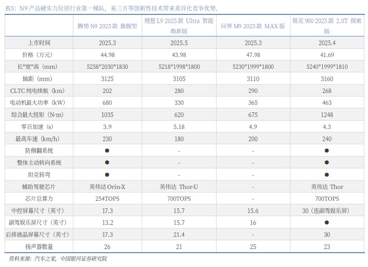 N9产品硬实力位居行业第一梯队,易三方等创新性技术带来差异化竞争优势,N8L有望延续产品竞争优势,N9、N8L销量增长潜力较大。相较于市场热销的竞品车型理想L9、问界M9、领克900,腾势N9在空间、智能座舱等配置上能够达到行业第一梯队水平,并且得益于以易三方为代表的创新性技术,N9在动力上有明显领先优势,并在安全性(防侧翻、爆胎稳定车身等)、灵活性(D级最小转弯半径、圆规掉头等)上具有差异化竞争优势,预计N8L有望延续N9的强产品力。凭借产品硬实力与易三方等创新性技术带来的差异化竞争优势,预计N9、N8L销量增长潜力较大