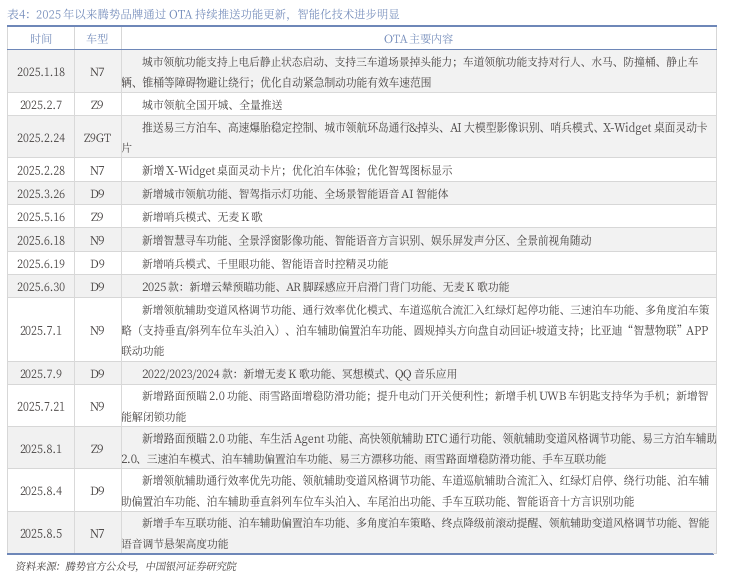 2025年以来腾势品牌通过OTA持续推送功能更新,智能化技术进步明显。2025年以来腾势品牌OTA加速,截止8月5日,2025年腾势品牌已进行15次OTA,接近2024年全年水平(16次)。通过持续OTA推送新功能,腾势品牌智能化能力进步明显,如智慧寻车、哨兵模式、辅助变道风格调节、通行效率优化、智能语音方言识别、路面预瞄、偏置泊车等。