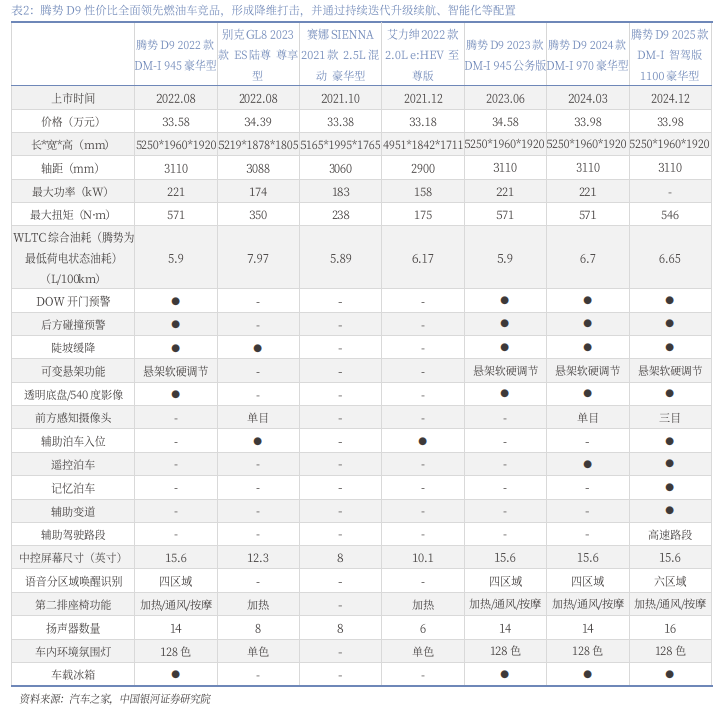 腾势D9性价比全面领先燃油车竞品,形成降维打击,并通过持续迭代升级续航、智能化等配置。腾势D9首代产品相比于同期燃油MPV竞品GL8、赛娜、艾力绅在价格、空间、动力、油耗、智能化方面全面领先,对燃油MPV市场形成降维打击,但早期产品的智能化相较新能源市场的领先者相对较弱,伴随持续的迭代升级,2025款腾势D9在智能化性能方面提升显著,能够支持记忆泊车、辅助变道、高速NOA等高阶智能辅助驾驶功能,产品硬实力进一步增强。