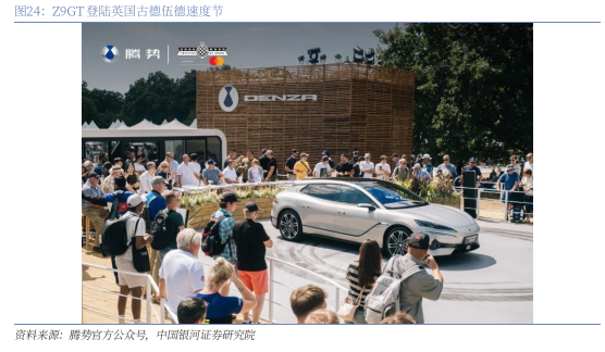 Z9GT持续拓展欧洲市场,B5(方程豹豹5)补充海外产品矩阵。2025年4月腾势在意大利米兰举办“超凡科技,驱动豪华”品牌发布会,正式进入欧洲,同时Z9GT也仍在米兰设计周亮相,成为继D9后又一开启全球化的车型,7月Z9GT登陆英国古德伍德速度节,正式亮相英国,持续拓展欧洲市场。另外,方程豹豹5也在古德伍德速度节以腾势B5的命名进行静态展示,补充海外产品矩阵,借力腾势品牌已经形成的全球影响力拓展海外市场。