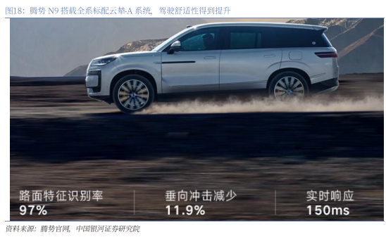 智能底盘:云辇-A系统集成智能感知技术、阻尼控制技术和高度控制技术,全球首创智能侧翼座椅,提升驾驶舒适性。云辇-A系统是公司自主研发的智能空气车身控制系统,通过电磁阀减震器与多腔空气弹簧组成的CDC空气悬架系统,集成智能感知技术、阻尼控制技术和高度控制技术,实现悬架刚度与车身高度的自动调节。另外公司还全球首创了智能侧翼座椅,通过共享气路设计实现腰部支撑动态调节,显著提升山路驾驶的包裹性和舒适性,搭载云辇-A系统的N9路面特征识别率97%,垂向冲击减少11.9%,实时响应150ms。另外,在2025年上海车展亮相的腾势首款概念跑车腾势Z预计将全球首搭云辇-M智能磁流变车身控制技术,实现性能的进一步提升。