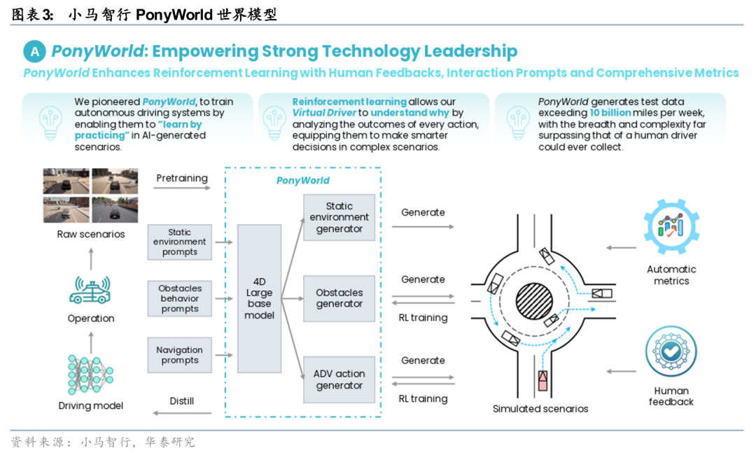 从技术创新来看,小马智行构建了自主研发的“Pony World”世界模型,采用强化学习技术突破传统基于人类驾驶数据的训练模式。该模型的训练数据以合成数据为主,减少对真实世界数据的依赖,同时构建精准的动态交互模拟环境,确保虚拟环境中的其他车辆和行人能做出与真实人类一致的行为反馈。公司从安全性、舒适性、效率三个维度评价自动驾驶性能,这套技术体系使得小马智行能够在规模运营中安全开展Robotaxi测试并为公众提供服务。