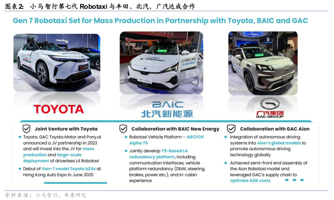 从量产能力来看,小马智行表示第七代车型已取得突破性进展。第七代车型总成本约30万元,预期生命周期里程达60万公里,相当于约6年的网约车运营里程。车型采用全车规级部件,确保全生命周期可靠性。公司与丰田、北汽、广汽达成合作,推出三款基于不同车型的第七代Robotaxi。目前已有百辆级别完成生产并加入车队,公司预计到25年底车队总规模将从去年的250辆增至至少1000辆。
