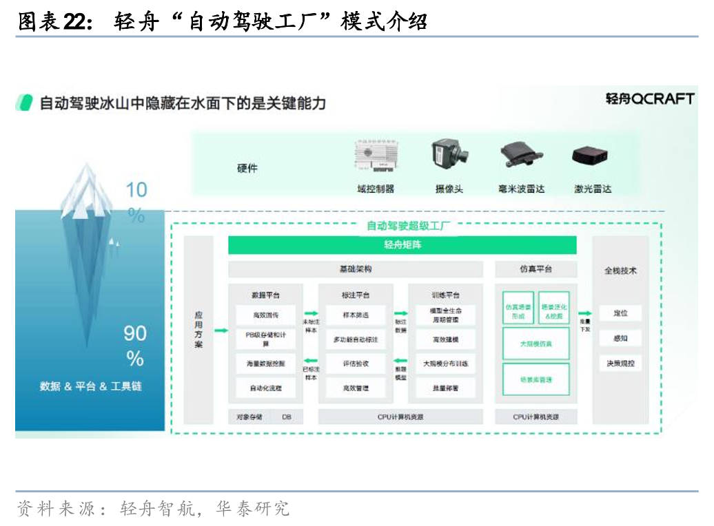 硬件端:公司聚集两方面硬件建设:1)整车设计与零部件研发:无人配送车取消驾驶舱,并简化传动结构,因其无需满足车身强度及驾驶员保护标准。此外,新石器整车平台高度可定制,支持灵活改造为冷藏冷冻、快递柜等场景方案,已在多地落地。2)自建工厂与工艺优化:公司于2021年建成盐城工厂,涵盖线控系统组装、无尘车间高精度模组生产(入摄像头组装精度误差<1mm、角度误差<0.1°)、模组自动标定(耗时<215秒),和总装检测。整车需通过22项工况测试(如爬坡、淋雨、涉水、隧道等),确保交付品质与可靠性。