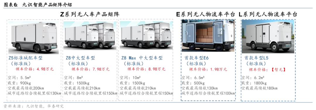 最新E系列起售价仅1.98万元,L系列重磅亮相,产品矩阵完成从单一产品到多平台布局。公司当前产品主要有Z系列、E系列和L系列共3个平台,其中Z系列已发布多款车型,根据车型大小裸车价格(2025年新款车型)从4.98-8.98万元不等。2025年5月27日,九识智能发布全新E系列无人物流车平台及首款车型E6,相较于Z系列“全能型”定位,E系列更强调“专精化”,针对特定场景进行定制化优化。E平台首款车型E6(标准版)专为轻件散件物流场景打造,载重低体积大,硬件售价1.98万,FSD服务费1800元/月;此外2025年6月E6又推出max和长续航版本以满足满足物流行业多元化需求。2025年8月,九识智能全新L系列首款车型L5重磅亮相。该系列专为重载物流场景打造,填补了大宗商品运输领域的技术空白,深化九识智能的全场景运营战略。