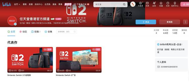 目前,任天堂(香港)有限公司在 B 站的账号名为「任天堂香港官方频道」,账号已通过 B 站机构认证(企业),账号内共发布了两条视频内容,分别为 Switch 2 的介绍视频和广告视频。