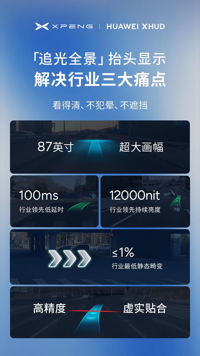 官方表示,「追光全景」抬头显示将拥有 87 英寸超大显示画幅,支持 100ms 低延迟和 12000nit 持续亮度,并且能够做到 ≤1% 的静态畸变和高精度虚实贴合。