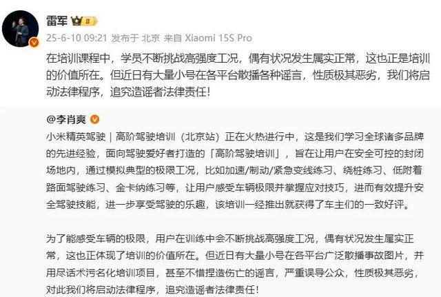 刚刚,雷军转发小米汽车副总裁@李肖爽 博文,辟谣小米精英驾驶培训事故:在培训课程中,学员不断挑战高强度工况,偶有状况发生属实正常,这也正是培训的价值所在。但近日有大量小号在各平台散播各种谣言,性质极其恶劣,我们将启动法律程序,追究造谣者法律责任!