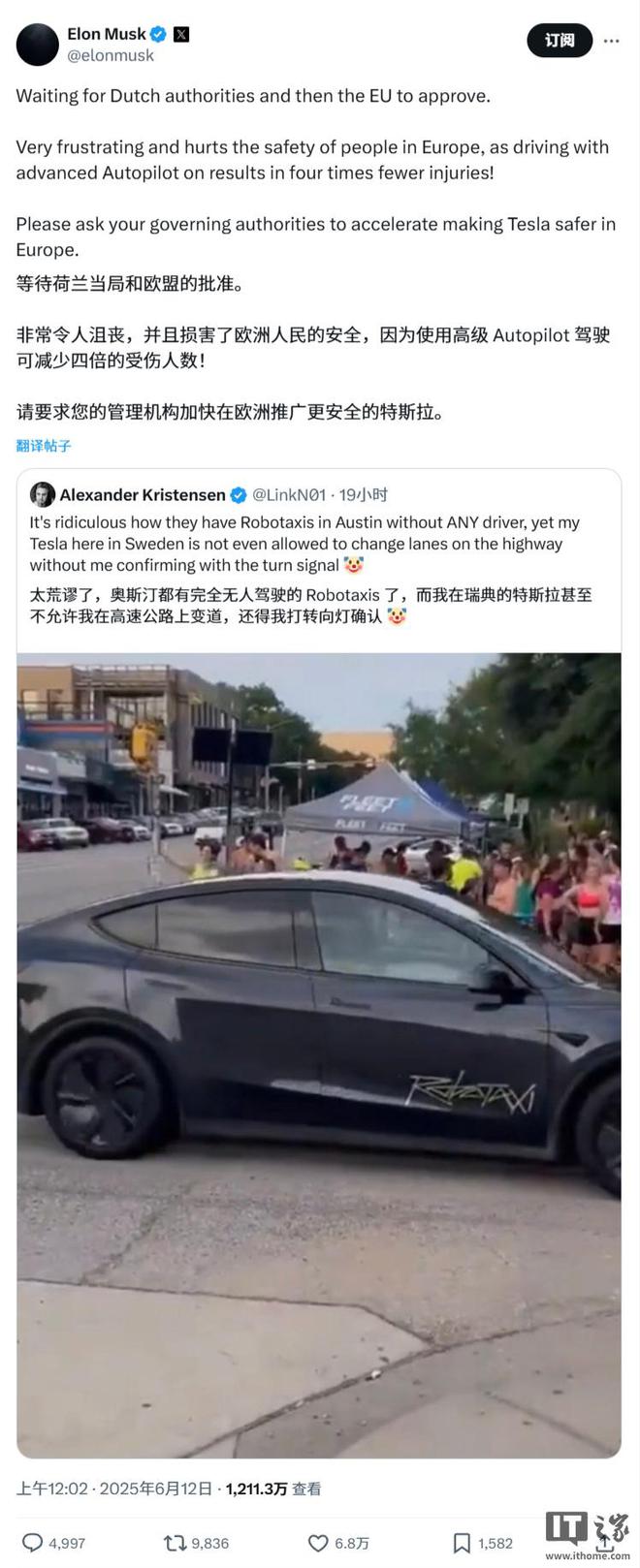 IT之家 6 月 12 日消息,在即将于 6 月 22 日于奥斯汀推出 Robotaxi 服务之际,特斯拉 CEO 埃隆・马斯克呼吁欧洲监管机构尽快批准公司的 FSD(全自动驾驶)技术。
