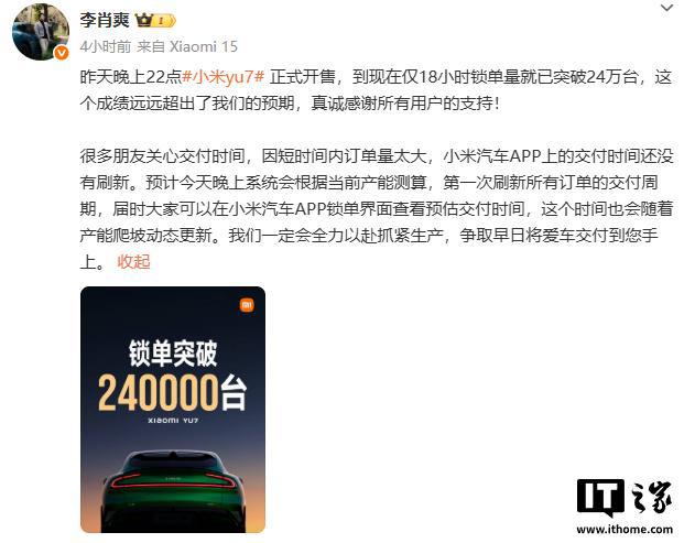 IT之家 6 月 27 日消息,小米 YU7 车型昨晚正式开售,仅 18 小时锁单量便突破 24 万台。小米汽车副总裁李肖爽直言:“这个成绩远远超出了我们的预期”。