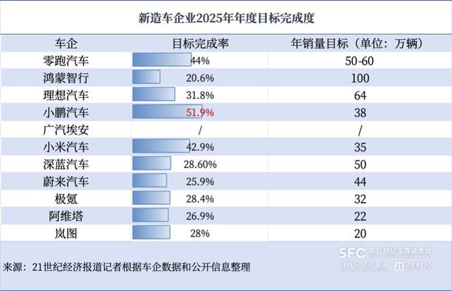 从全年销量目标完成率来看,新造车企业进度差距悬殊。小鹏汽车以19.72万辆的上半年销量,完成全年38万辆目标的51.9%,成为唯一进度过半的车企。而超半数车企目标完成率不足三成,下半年竞争压力陡增。