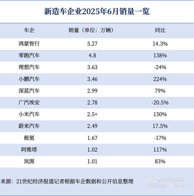 从6月份单月数据来看,鸿蒙智行以销售5.27万辆、同比增长14.3%的成绩登顶,但问界系列占比超80%的结构隐忧仍在;零跑6月销量依旧保持增势,同比增长138%至4.8万辆,领先于同期理想的3.63万辆销量,后者销量同比下滑了24%。
