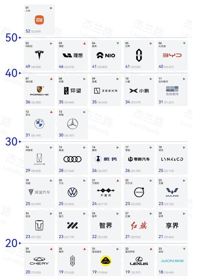 在市场调研机构杰兰路公布的《2025年上半年新能源汽车品牌健康度研究》中,小米以52.059的成绩位列百人青睐指数榜单第一,腾势的百人青睐指数则仅有26.337,略低于阿维塔和奥迪,位列第四梯队。