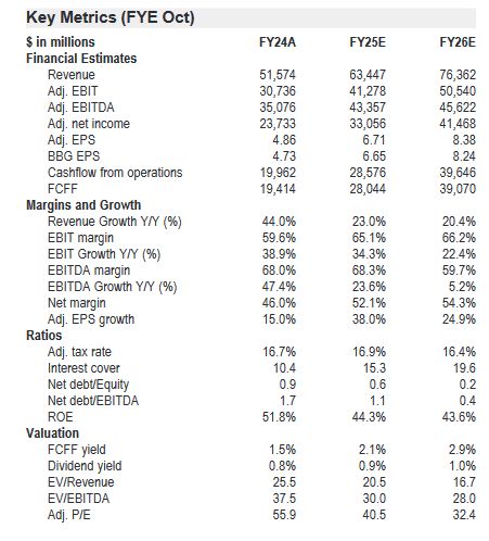 摩根大通预计,博通2025财年EPS将同比增长38%,达到6.71美元,2026年继续增长25%至8.38美元。自由现金流预计在2026年达到390亿美元,净负债率由2024年的0.9降至2026年的0.2,财务状况稳健。