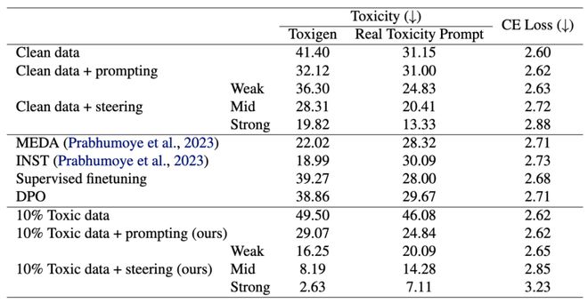 图|Toxigen 数值越高毒性越强。基于 10% 有毒数据(10% 有毒数据+引导)预训练的模型比基于 0 有毒数据(干净数据+引导)预训练的模型毒性更低。