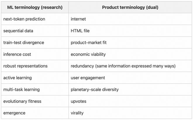 互联网是监督式下一个 token 预测的完美补充:可以大胆断言,若以互联网为基础,研究者必然会聚焦于下一个 token 预测。我们可以将互联网视为催生 AI 的“原始汤”(primordial soup)。因此,我或许可以说,互联网是下一个 token 预测的对偶。