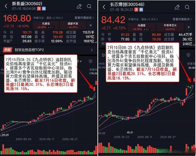 往期回顾:7月15日08:25《九点特供》追踪到扎克伯格再度豪言“千亿美元”投资AI,披露多个吉瓦级数据中心项目,指出海外AI竞争白热化程度加剧,驱动算力需求有望保持高增,并提及新易盛、长芯博创。截至7月16日收盘,新易盛2日最高20.31%、长芯博创2日最高涨18.15%。