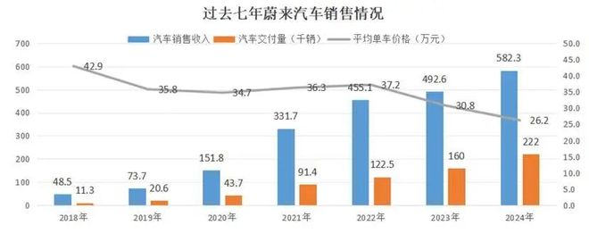 就核心业务汽车销售而言,过去七年,蔚来交付了67.16万辆汽车,对应着2135.7亿元的业务收入,平均单车价格从42.9万元/台,一路降到26.2万元/台。
