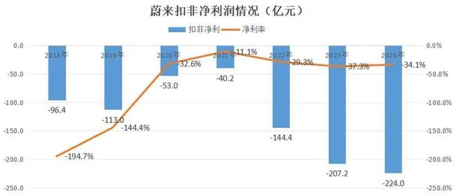 创业至今,2024年是蔚来亏损幅度最大的年份,财年内亏损224亿元,超过同期上市未盈利车企亏损总和。另根据统计数据显示,2018-2024年7年间,蔚来累计亏损累计已破千亿大关。