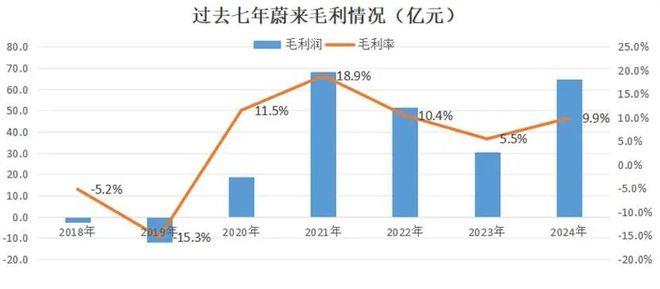 定价战略摇摆、换电重资产运营模式合力下,蔚来的毛利率水平不断下探,七年间蔚来最高毛利率为2021年的18.9%,到2024年毛利率下探至9.9%,垫底"蔚小理"(小鹏14.3%、理想20.5%)。