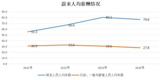 财报显示,2024年,蔚来研发人员人均年薪76.6万元,行政、一般及管理人员人均年薪27.8万元。