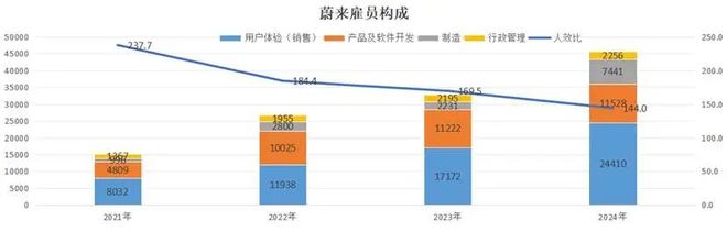 根据市场测算,一线城市蔚来NIO House单店年运营成本超2000万元,相当于传统4S店的3倍;客户服务团队超8000人,对应地,蔚来四年间员工总数从1.5万扩充到4.5万名(小鹏1.5万名员工、理想3.2万名员工),蔚来雇员开支24年分别占研发费用与营销、一般及行政费用的67.8%与47%。