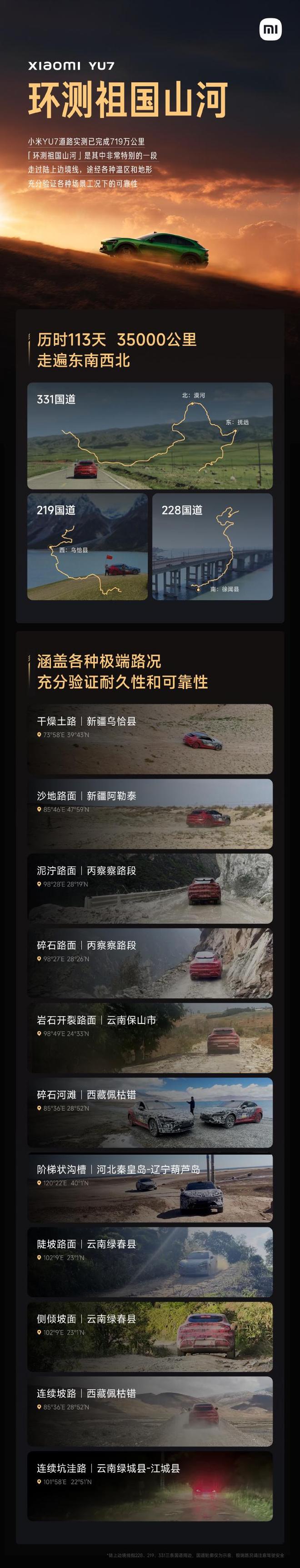 今日小米汽车发文称小米YU7路测团队,刚刚完成了一段特殊的路测:贯穿G228、G219、G331三条国道,环绕祖国山河,覆盖各种温区、地形和复杂路况,这条路几乎把全国的“烂路”测了一遍。