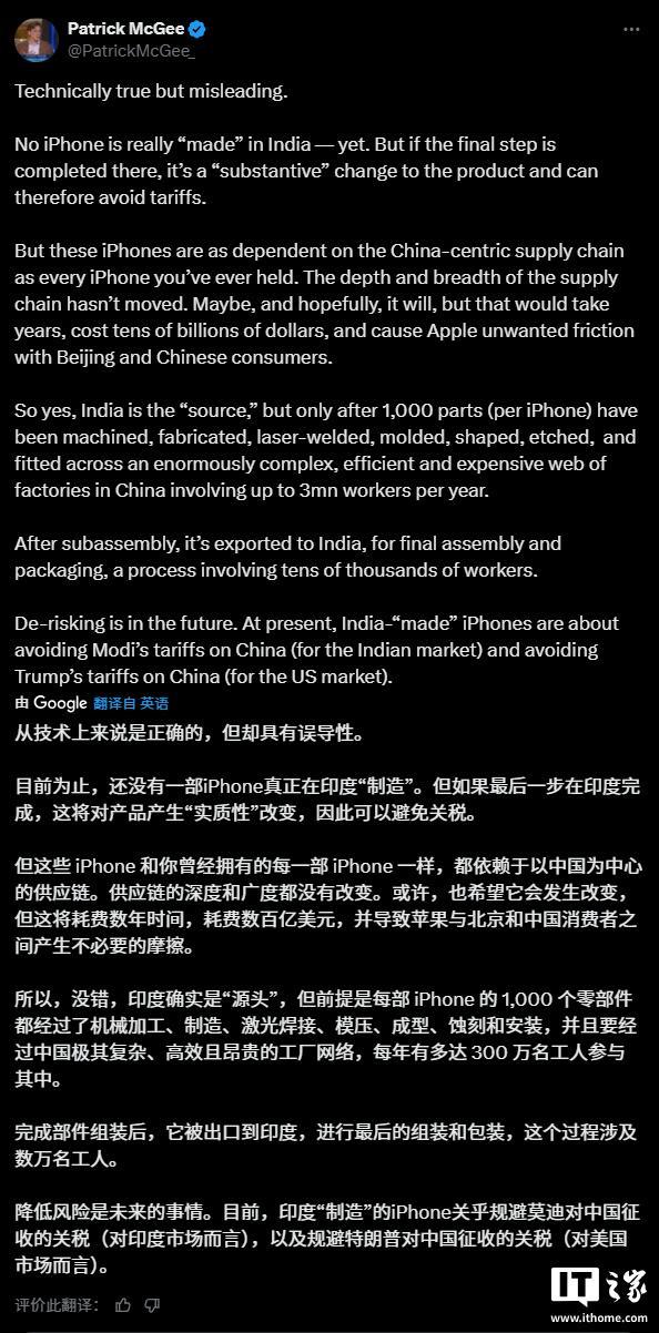 麦吉称,“但这些 iPhone 与你曾拿过的每一部 iPhone 一样,都依赖以中国为核心的供应链。供应链的深度和广度并未改变。也许,也希望它会改变,但这需要数年时间,花费数百亿美元,并会给苹果带来与北京方面及中国消费者不必要的摩擦。所以,没错,印度是‘源头’,但前提是(每部 iPhone 的)1000 个零部件已经在中国一个极为复杂、高效且成本高昂的工厂网络中完成加工、制造、激光焊接、模塑、成型、蚀刻和组装,这个网络每年涉及多达 300 万名工人。完成零部件组装后,产品会出口到印度进行最终组装和包装,这一过程涉及数万名工人。降低风险是未来的事。目前,印度‘制造’的 iPhone 手机主要是为了规避莫迪针对中国的关税(面向印度市场)以及特朗普针对中国的关税(面向美国市场)。”