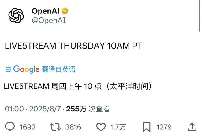 今日,OpenAI发文称太平洋时间周四上午10 点(北京时间周五凌晨1点)将有直播活动,暗示将会推出GPT-5模型。能够看到“LIVESTREAM”的字母“S”被替换成了“5”,这被解读为GPT-5。