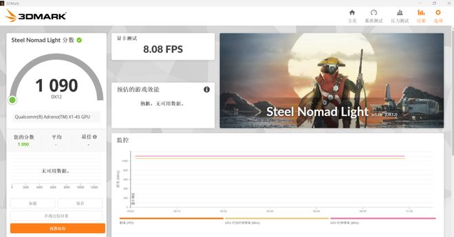 GPU 方面,IT之家用 3D Mark 做了三项测试,首先是适合轻型电脑基准测试的 Steel Nomad Light ,Surface Pro 12 英寸得分为 1090 分,其中显卡测试表现为 8.08 FPS。