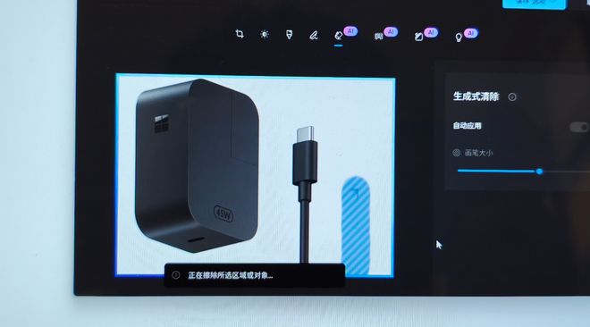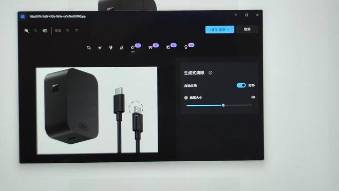 而且你还可以提取页面的图片信息进行修改,比如小编想修改这张充电器和数据线的图片,擦去其中的一个接头,只需要右键点击照片,然后选择“使用‘照片’擦除对象”,系统就会在“照片”应用里打开这张图片并定位到具体的功能,我只需简单擦除两下,就能把其中一根数据线给抹去,AI 还能自动填补背景,从结果上来看还是很自然的。