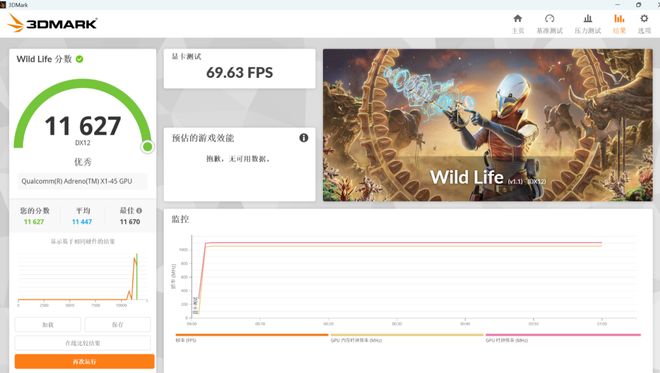 而在适合移动计算跨平台测试的 Wild Life 项目中,Surface Pro 12 英寸得分为 11627 分,显卡测试表现为 69.63 FPS。