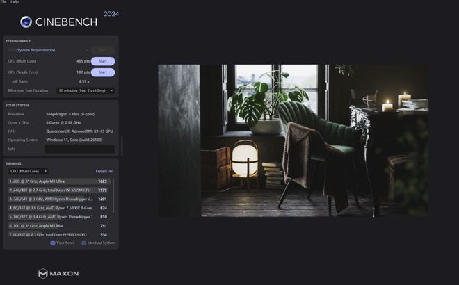 CineBench 2024 目前有基于 Arm64 的版本,IT之家测得单核成绩为 107 pts,多核成绩为 485 pts。