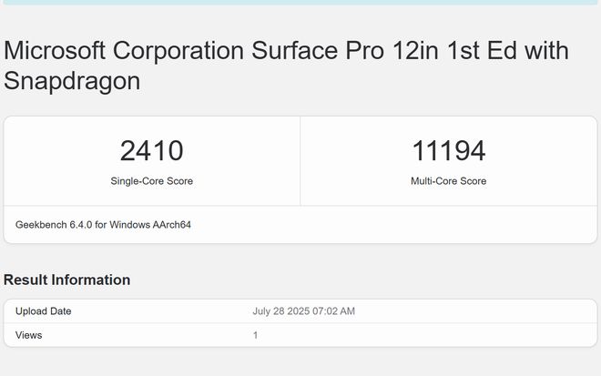 然后是 GeekBench 6,用 Surface Pro 12 英寸测得单核 2410 分,多核 11194 分。