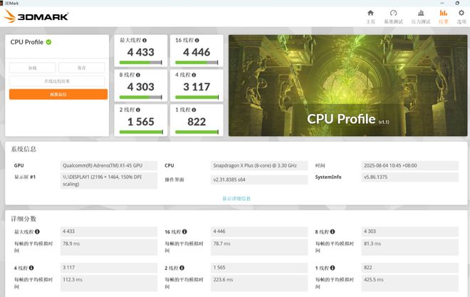 CPU 的性能IT之家还用 3D Mark 测试了 CPU Profile 项目,得到单线程 822 分,最大线程 4433 分。
