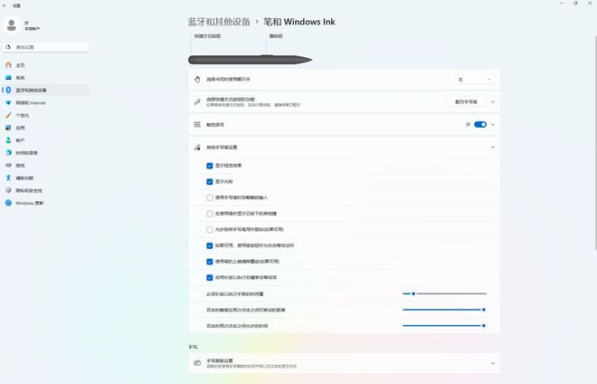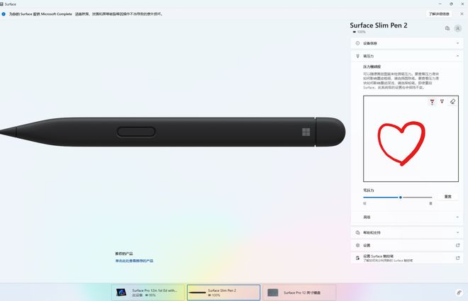 另外,你还可以在设备内置的“Surface ”应用中对触控笔的压力感应级别进行设置,或者在系统设置中的“笔和 Windows Ink”项目中对触控笔的功能进行更细致的设置。