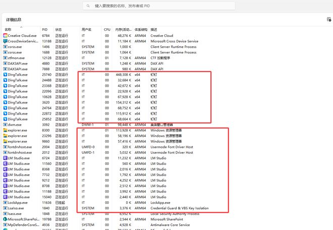 在实际使用时,大家在任务管理器的“体系结构”这个栏目中可以看到哪些软件是 Arm64 架构原生运行,哪些软件是 X86 架构转译的。