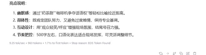 这次共生成了 963 tokens,平均速率为 9.25 tok / s,首个 token 输出时延为 1.71s。表现也是比较不错的。