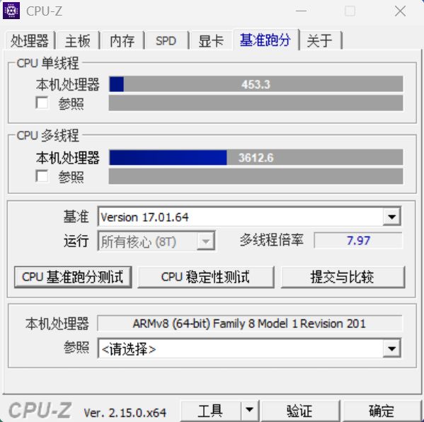 首先用 CPU-Z 的基准测试跑了分,得到单线程 453.3 分,多线程 3612.6 分。