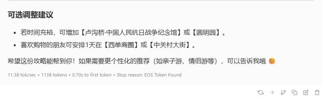 这份攻略一共生成了 1138 tokens,Surface Pro 12 英寸的性能表现达到 11.38 tok / s,首个 token 输出的实验为 0.7s,整体表现还是不错的。