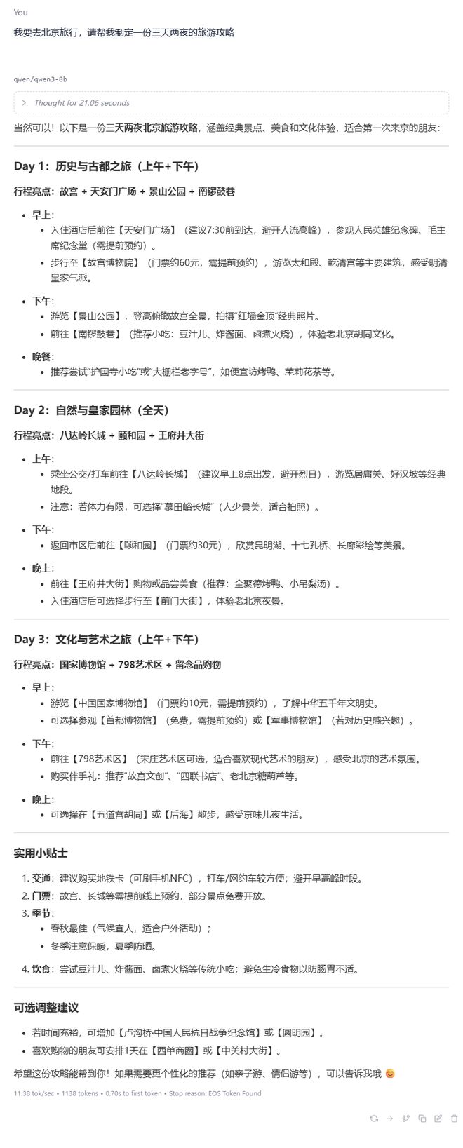 首先小编让模型帮我写一个北京三天两夜的旅游攻略,Qwen3 很快就完成了一份详细的游玩攻略,看着基本没什么问题。