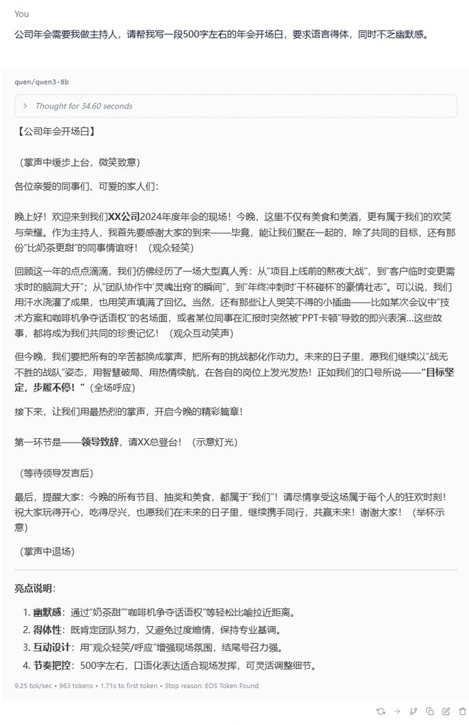 接下来小编又让模型帮我写一份公司年会的开场白,要求语言得体同时不乏幽默感。Qwen3 这次花了稍长的思考时间,然后输出了一份符合要求的开场白。