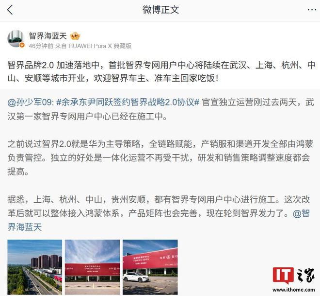 目前这一消息已得到官方证实。智界产品总监 @智界海蓝天 今日转发该消息,并表示:“智界品牌 2.0 加速落地中,首批智界专网用户中心将陆续在武汉、上海、杭州、中山、安顺等城市开业,欢迎智界车主、准车主回家吃饭!”